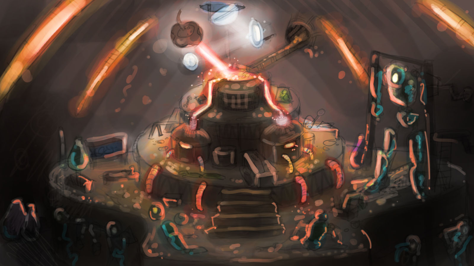 I think I will "zoom out" the view more, and have robots around the bottom half of the walls like I did in my earlier thumbnail, and feature some weapons and more robots inprogress and weapons on the bottom.